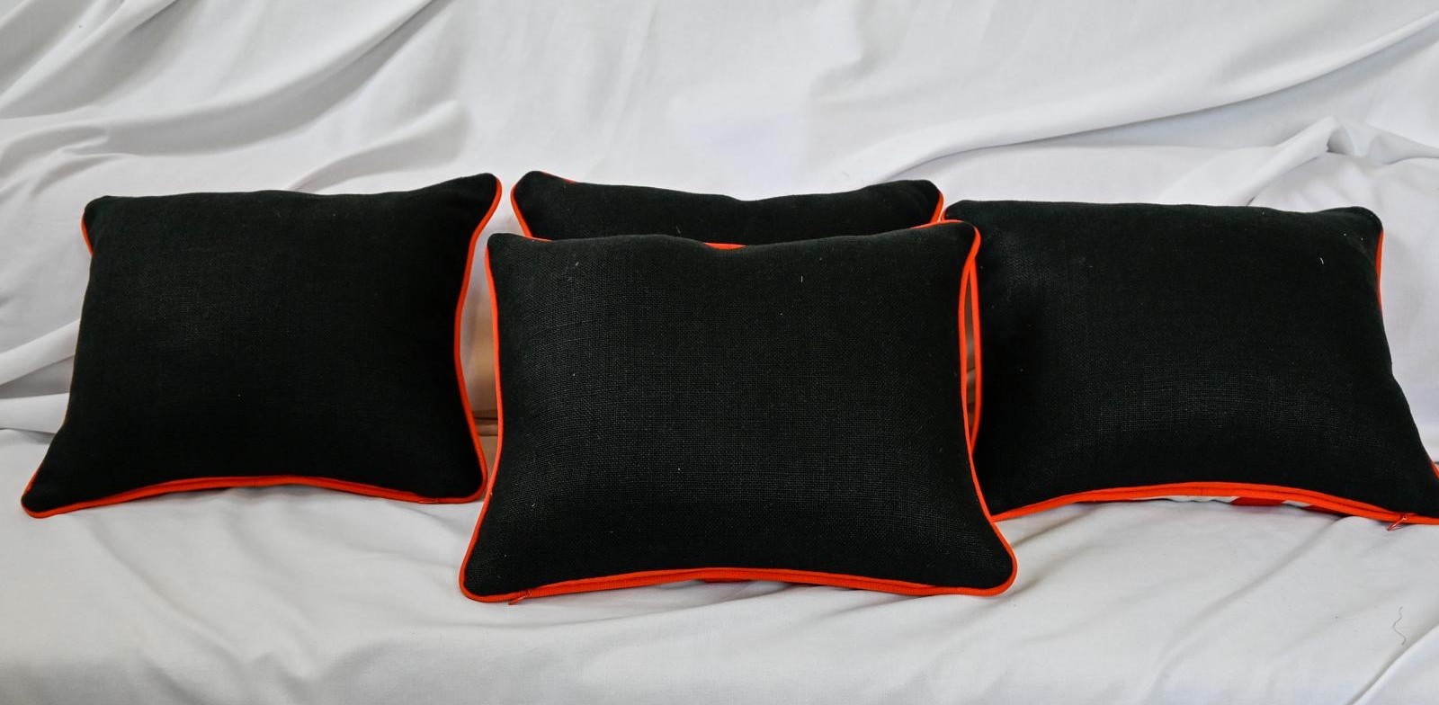 Embroidery in bright orange on white linen, back in black linen and profiles in orange grosgrain.
