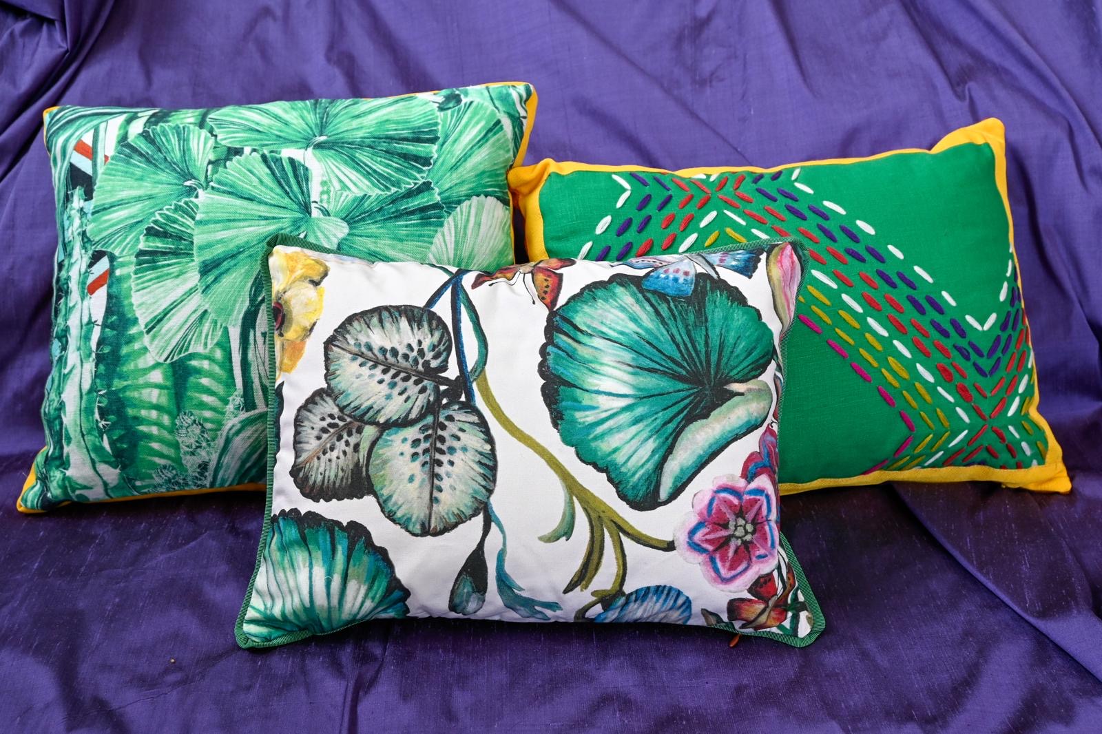 Fresh colors like a dip in the sea, surreal designs. Linen and cotton printed on the front, linen and cotton for the back, 100% cotton border.