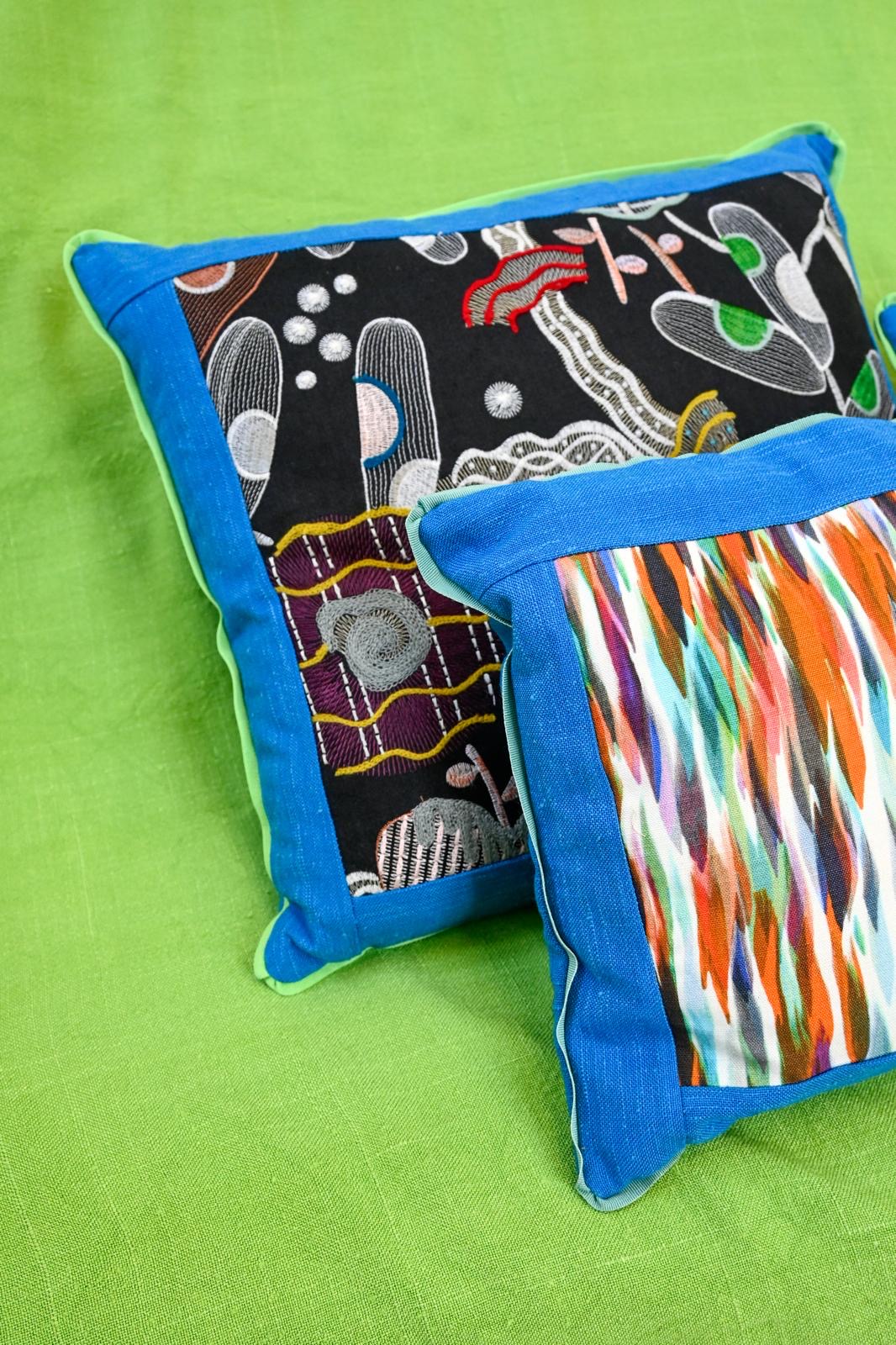 It is impossible to describe how bright and eye-catching the blue of the back of these decorative pillows is. It perfectly highlights the dreamlike world of the prints and embroidery on the front.