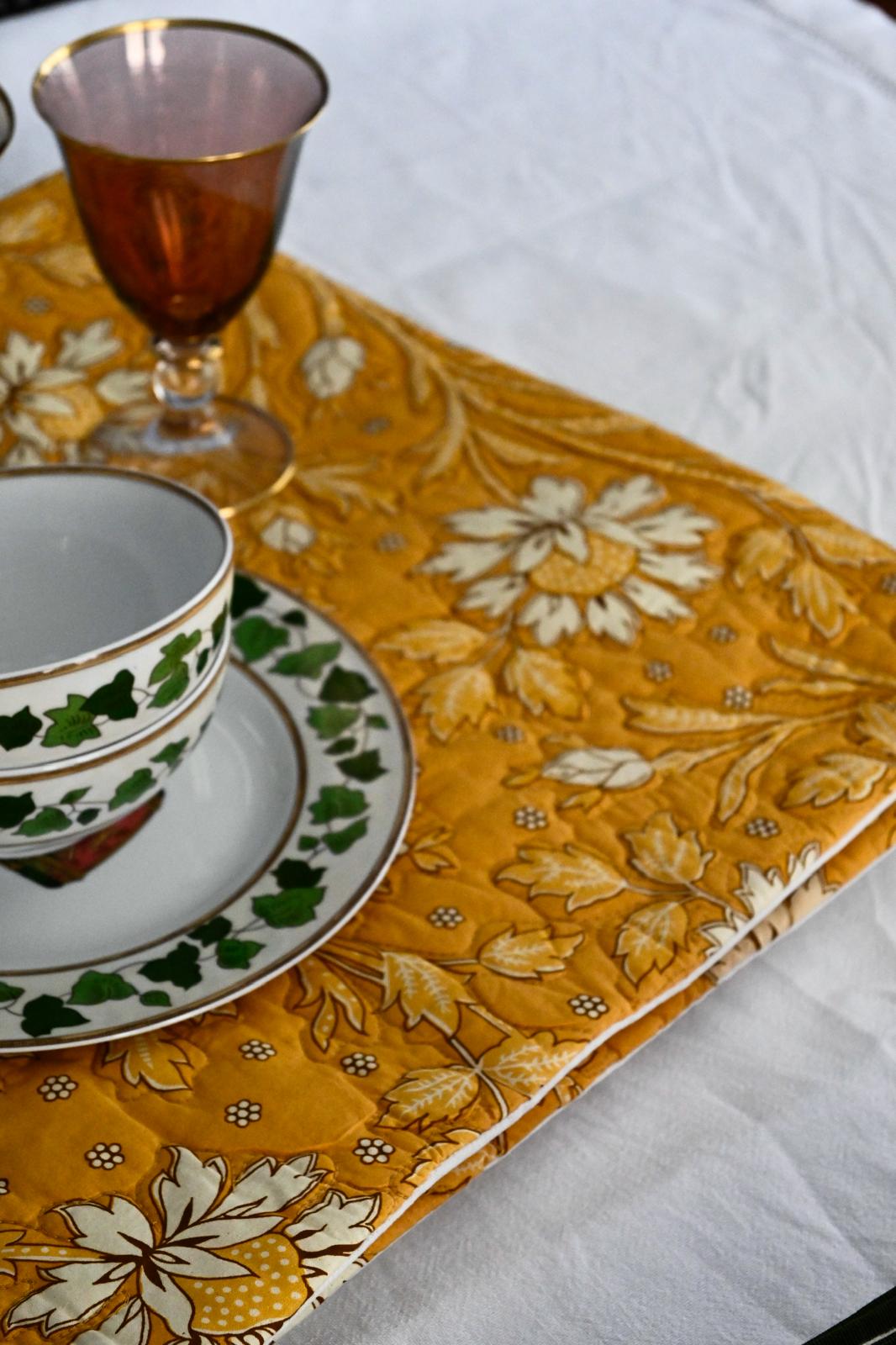 Number 6 American in sunflower yellow cotton, with large white and yellow flower print. Lightly padded and quilted along the floral design. REVERSIBLE (2 placemats for the price of one!). Back in milky white peach-touch cotton. SIZE 52 X 42 cm WASH IN WATER MAX 40 DEGREES. DO NOT DRY WITH THE DRYER, BUT WELL LAY OUT ON THE CLOTHING RACK! THE PRICE IS FOR THE PURCHASE OF 1 PLACEMAT. I RECOMMEND BUYING IN A GROUP AND TAKING ADVANTAGE OF THE DISCOUNT. 1 PLACEMAT 20 EUROS, 6 PLACEMATS 110 EUROS!